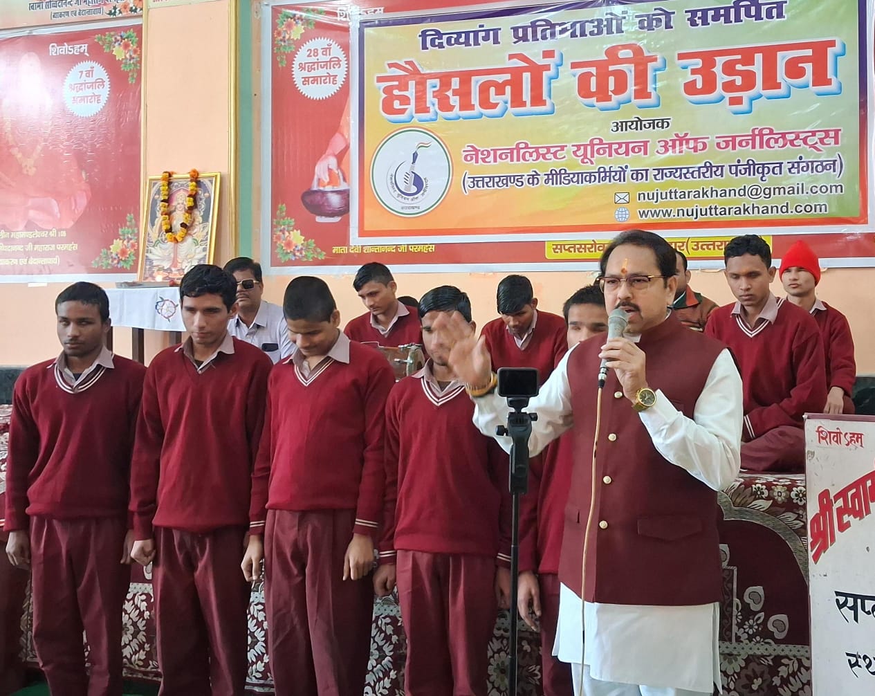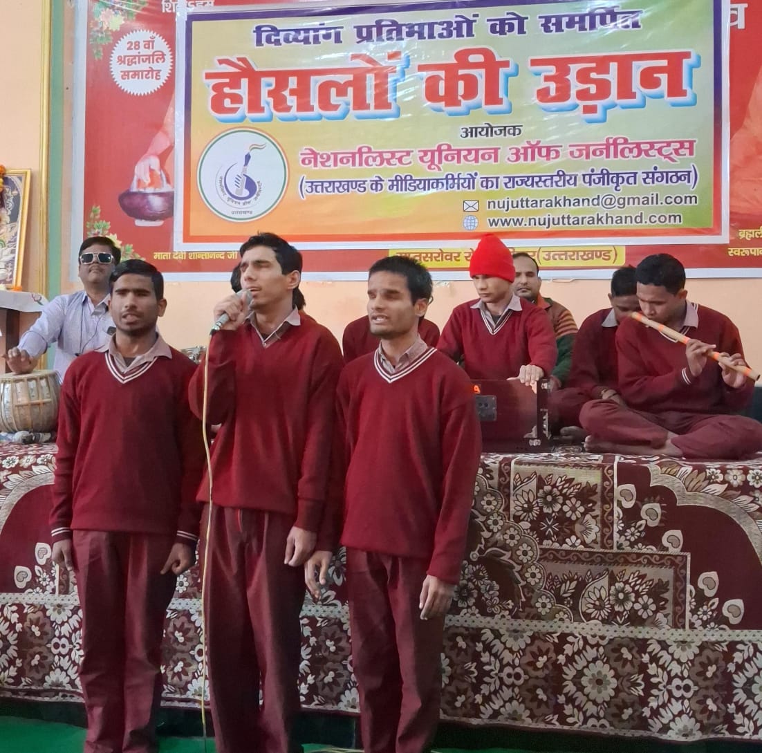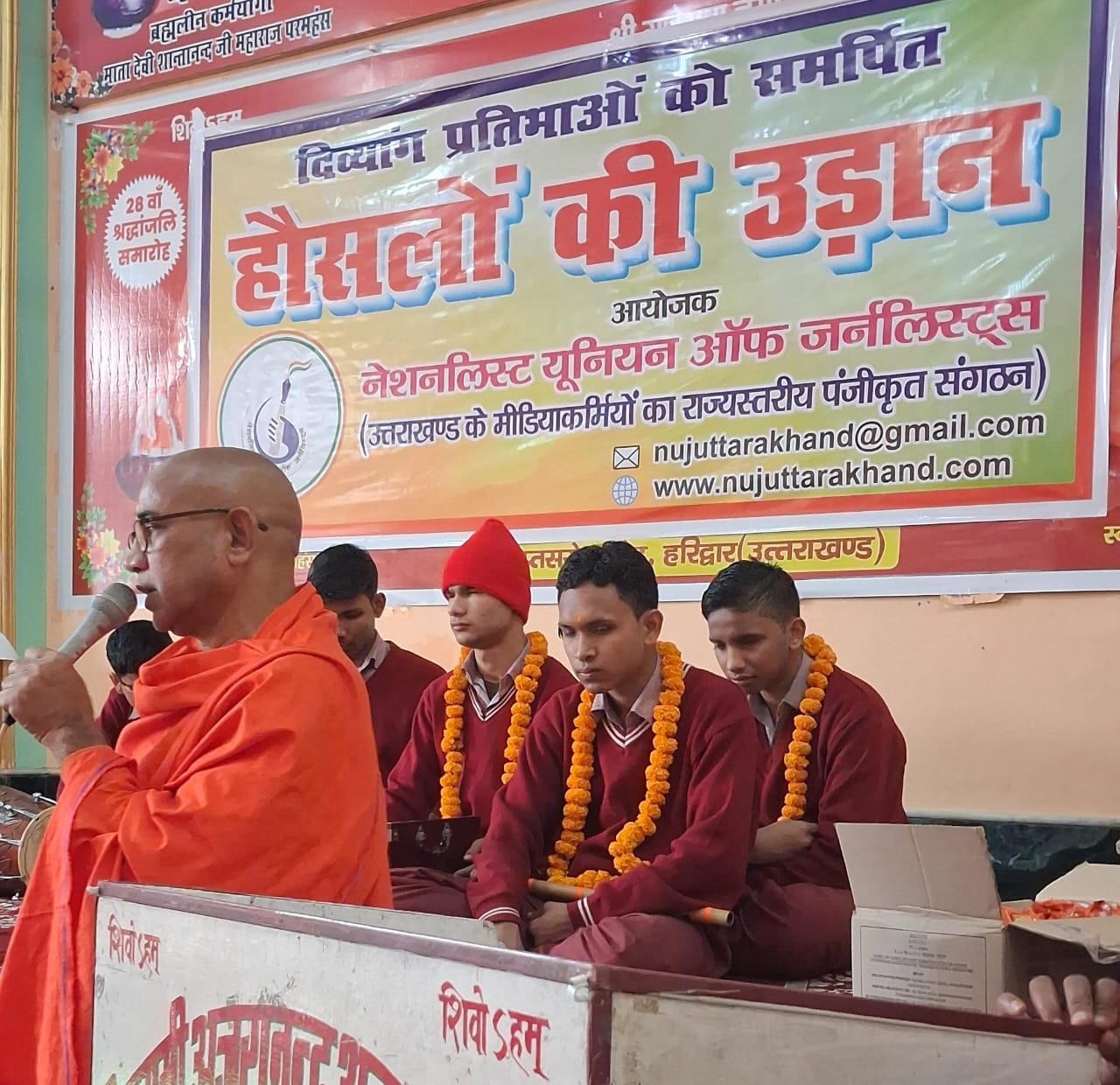 हरिद्वार। दिव्यांगों के सम्मान, अधिकारों, कल्याण तथा उन्हें आत्मनिर्भरता की प्रेरणा और प्रोत्साहन देने के उद्देश्य से दस वर्ष पूर्व, नेशनलिस्ट यूनियन ऑफ जर्नलिस्ट्स द्वारा आरंभ की गई मुहिम के तहत आज हरिद्वार में आयोजित ‘हौसलों की उड़ान’ कार्यक्रम में अनेक नेत्रहीन मेधावी विद्यार्थियों और अध्यापकों को सम्मानित किया गया। दिव्यांगों के अधिकारों, सम्मान और कल्याण को बढ़ावा देने के साथ विभिन्न क्षेत्रों में उत्कृष्ट प्रदर्शन करने वाले दिव्यांगों को सम्मानित और पुरस्कृत कर प्रोत्साहित करने के उद्देश्य से नेशनलिस्ट यूनियन ऑफ जर्नलिस्ट्स हर वर्ष इस तरह का कार्यक्रम आयोजित करती है। इसी क्रम में आज भूपतवाला स्थित “स्वामी अजरानन्द अंध विद्यालय” में यूनियन द्वारा शिक्षा के क्षेत्र में उल्लेखनीय उपलब्धि हासिल कर रहे 60 से अधिक नेत्रहीन विद्यार्थियों, शिक्षकों और अन्य दिव्यांगों को सम्मानित किया गया।